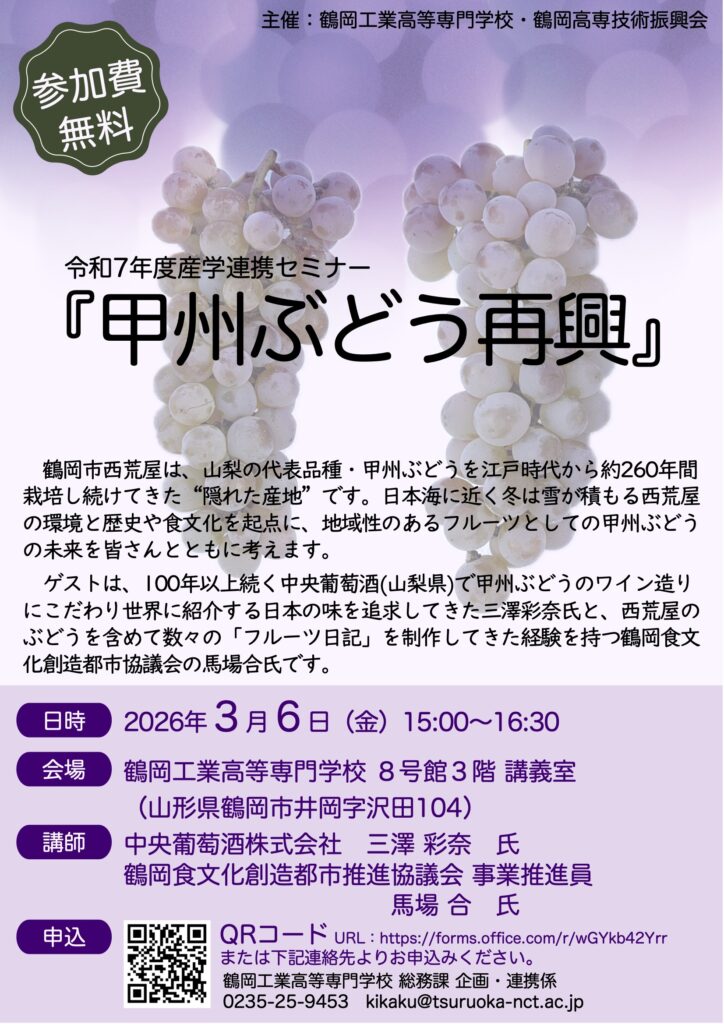 鶴岡工業高等専門学校では、県外の研究機関や企業を含む地域社会との情報交換を通して地域理解を深め、融合研究や新規事業創出、技術革新等の機会提供を目的とした「産学連携セミナー」を毎年開催しております。この度、令和7年度 産学連携セミナーを下記のとおり開催することとなりましたので、ご案内いたします。専門知識の有無や専門分野を問わず、どなた様もお気軽にご参加ください。